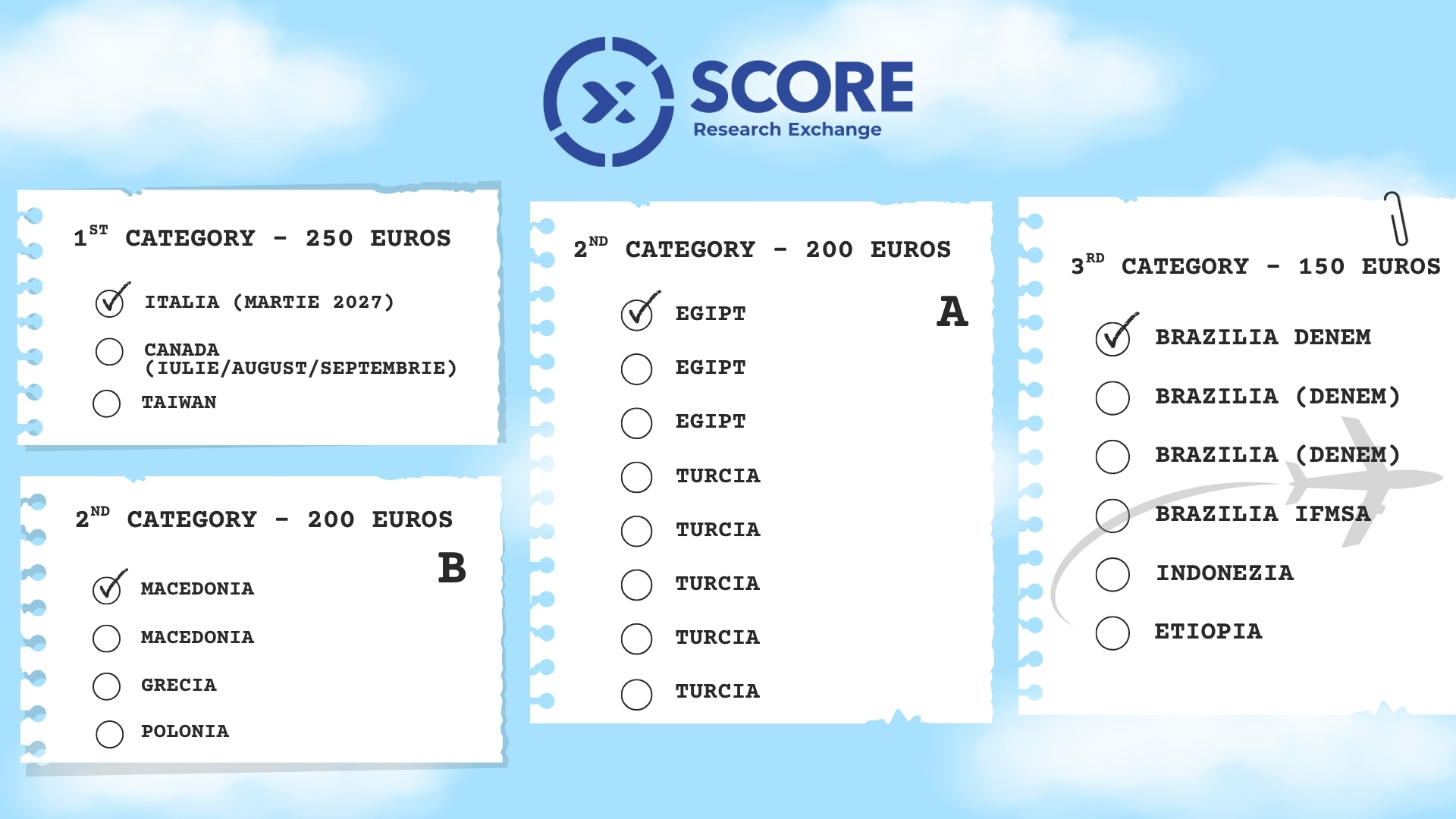 SCORE (Standing Committee on Research Exchange) oferă studenților mediciniști oportunitatea unică de a participa la stagii clinice și de cercetare internaționale, prin intermediul Federației Internaționale a Asociațiilor Studenților în Medicină (IFMSA).